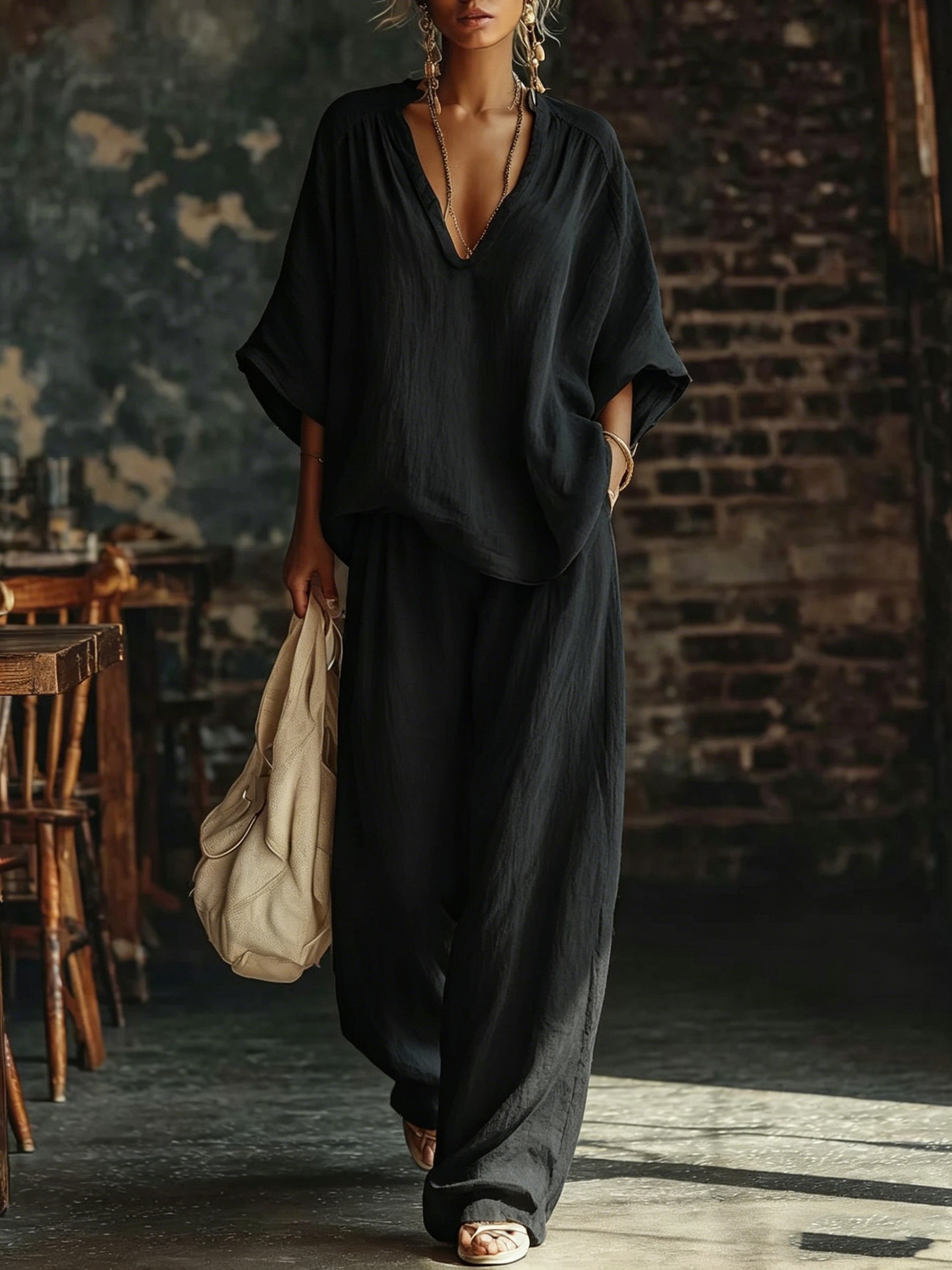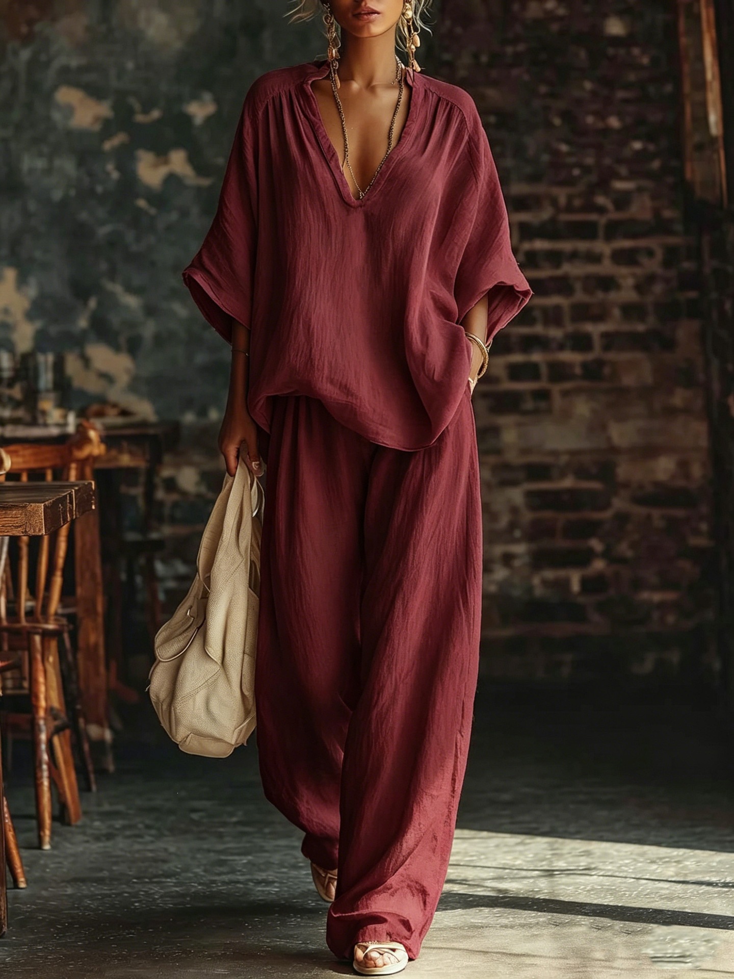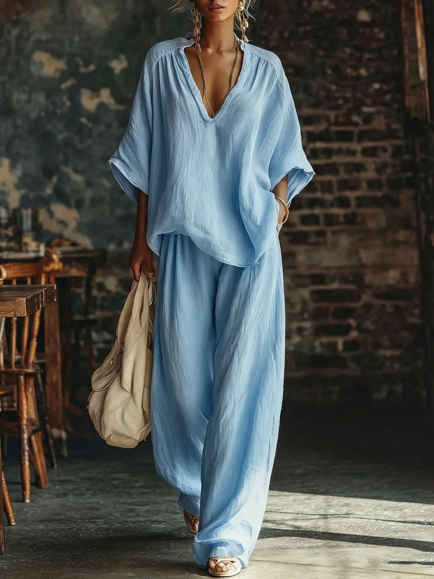 Womens V-neck Loose Short-Sleeve Casual Pants Two-Piece Set